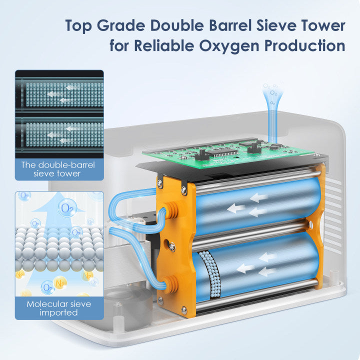 NT-05 uses a double-barrel sieve tower and high-grade molecular sieves to produce highly purified oxygen. This state-of-the-art filtration ensures reliable performance and a smooth, comfortable breathing experience.