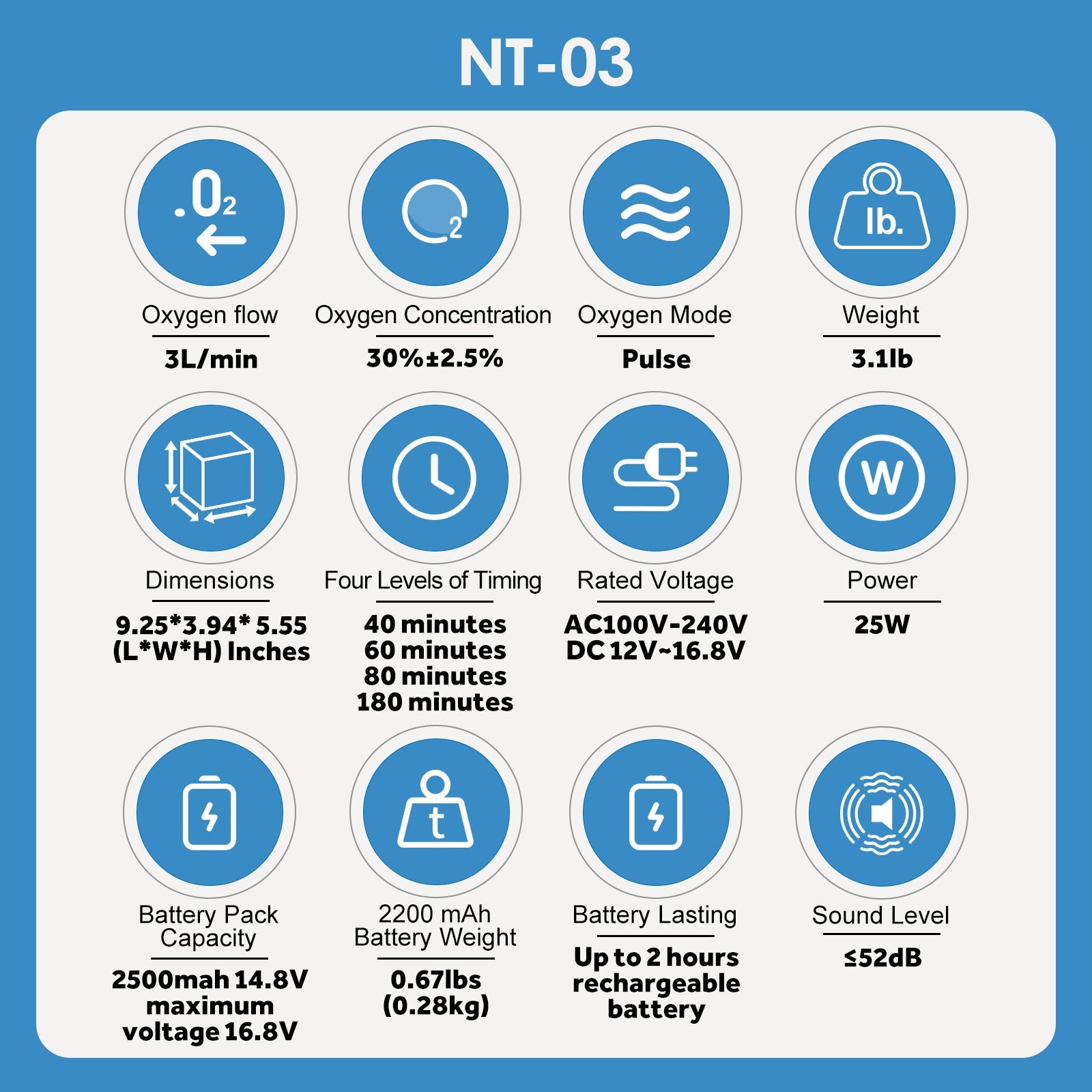 Perfect for anyone who needs oxygen on the go. Weighing just 3.1 lbs, NT-03 delivers pulsed oxygen for a natural breathing experience at home, in the car, or outdoors.