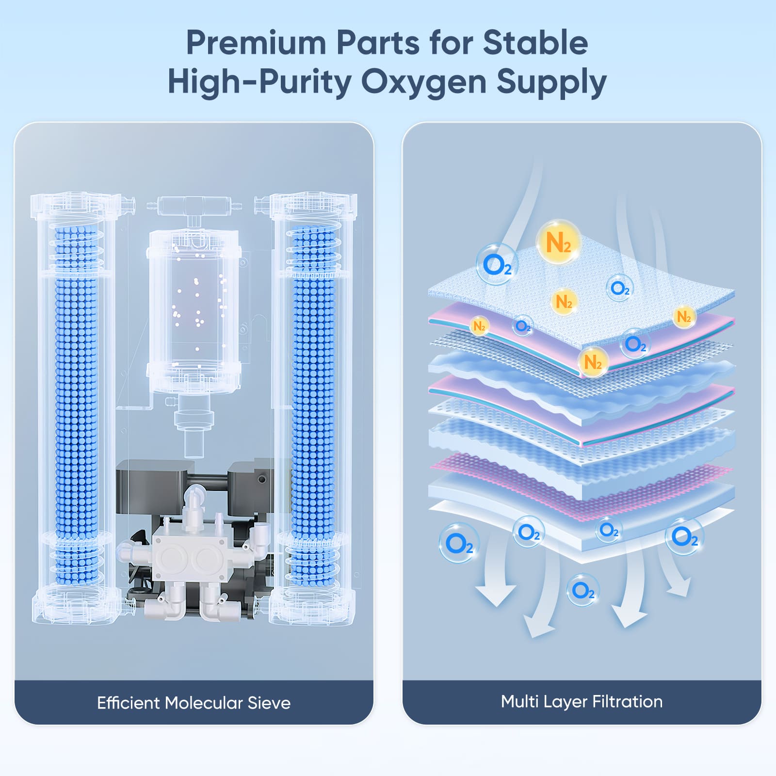 It delivers continuous oxygen at 93±3% across all flow settings (0.5–5 L/min). This ensures you receive the exact oxygen prescribed for steady, gentle, and comfortable breathing throughout your therapy.
