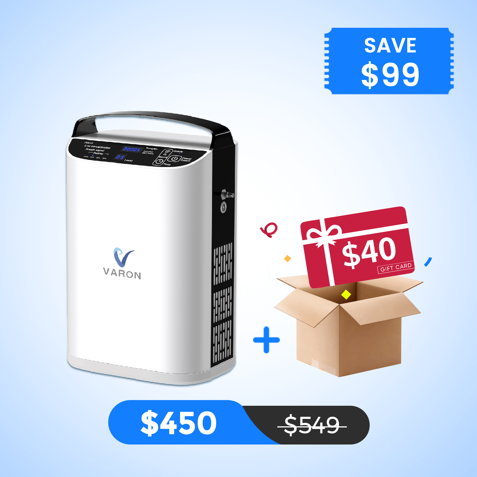 The VARON NT-01 portable oxygen concentrator features a user-friendly interface with a large touch screen. It includes a 'Grade' button on the operation panel to adjust the oxygen flow output according to your needs. You can use the 'Time' button to set the timer from 0 to 240 minutes. The screen also displays the cumulative usage time of the machine, the power of the internal battery, as well as the breathing sensor light, and safety alarm light, making it easy for individuals in need of oxygen therapy to breathe comfortably.