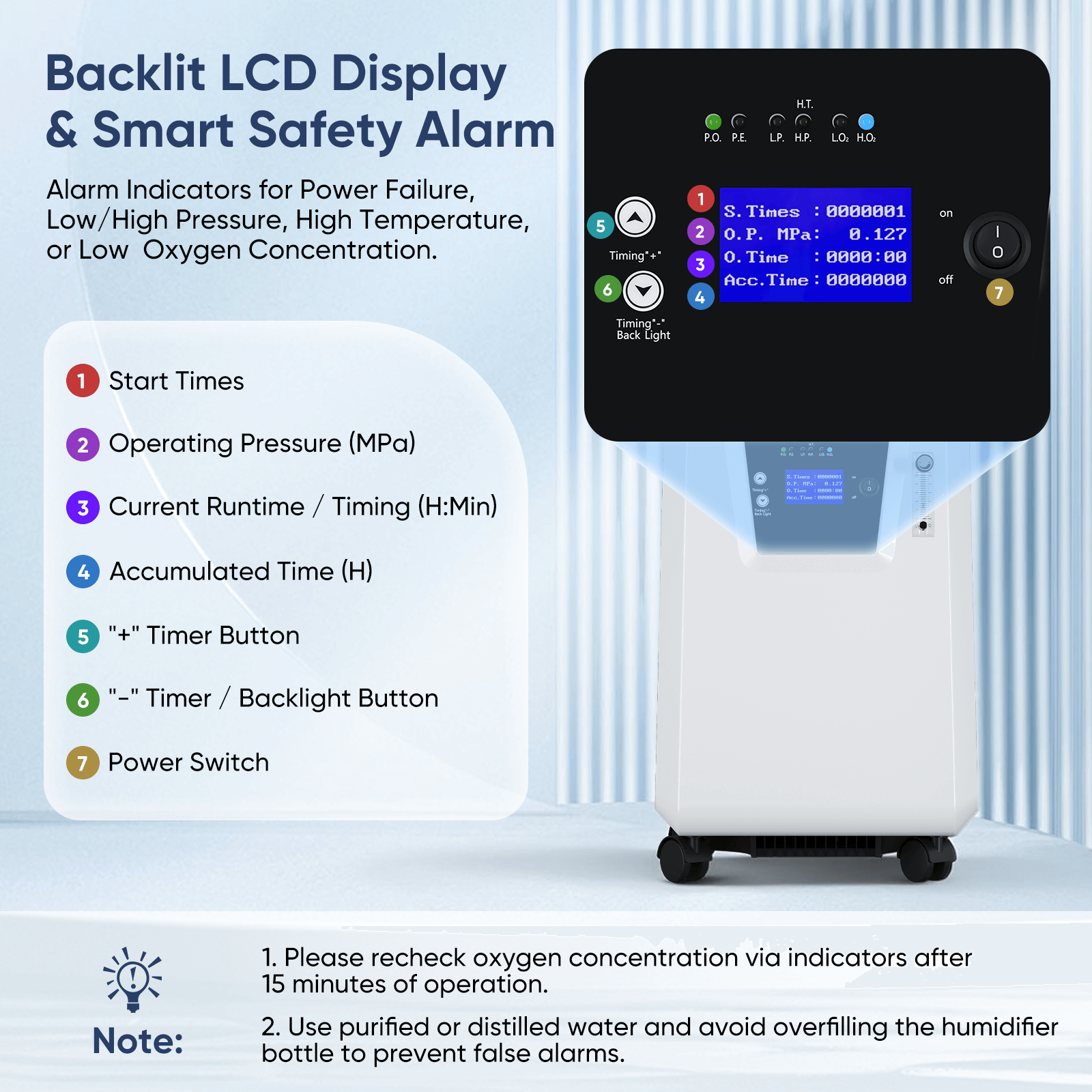 The intuitive LCD screen makes controlling the Serene 10 a breeze. Set auto shutdown times (10 to 40 minutes) with ease, and track important details like oxygen levels and internal pressure. Safety alerts notify you immediately of any issues, including power, low pressure, high temperature, or low oxygen concentration. Additionally, four universal wheels make moving the machine from room to room convenient and hassle-free, ensuring oxygen support wherever you go. With a carrying handle and four smooth casters, the heavy machine can be effortlessly moved from one place to another.